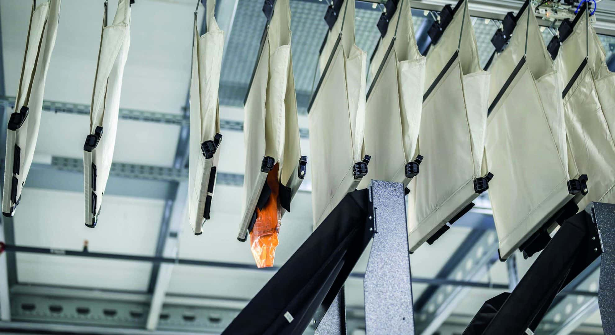 Fleksible Pocket Sorter-systemer er uundværlige, især inden for e-handel og omnichannel. Hængende varer og flade varer – såsom skjorter, sko eller tilbehør – kan alle transporteres og bufres sammen i ét system. EcoPocket er derfor ideel inden for e-handel og omnichannel, hvilket kræver høj ydeevne og meget sortering. Pocket Sorter-systemet er udstyret med RFID-teknologi til 100% sporing, nøjagtig identifikation og når som helst adgang til alle elementer i systemet. Intelligent matrixsortering bringer orden i ellers kaotisk bufferlagrede varer og giver en pålidelig 100% sekvens, sorteret efter de ønskede kriterier.
